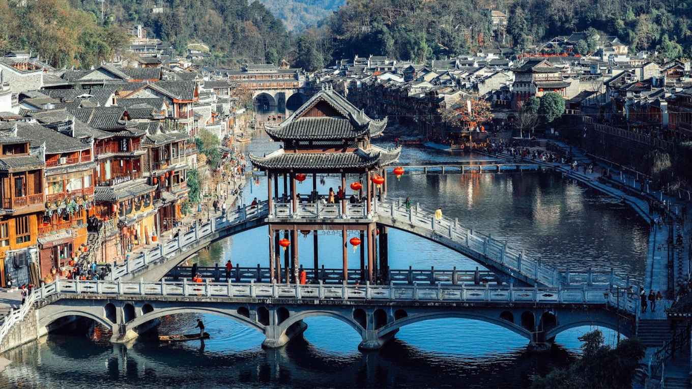 - Hồng Kiều - cây cầu cổ nổi tiếng tại Phượng Hoàng Cổ Trấn, bắc qua sông Đà Giang. Cầu được xây từ thời Minh – Thanh, có kiến trúc hai tầng độc đáo: tầng dưới để đi lại, tầng trên dùng để ngắm cảnh và thờ cúng. Ban đêm, cầu lung linh dưới ánh đèn lồng đỏ, tạo nên một khung cảnh thơ mộng, rất đặc trưng của cổ trấn.