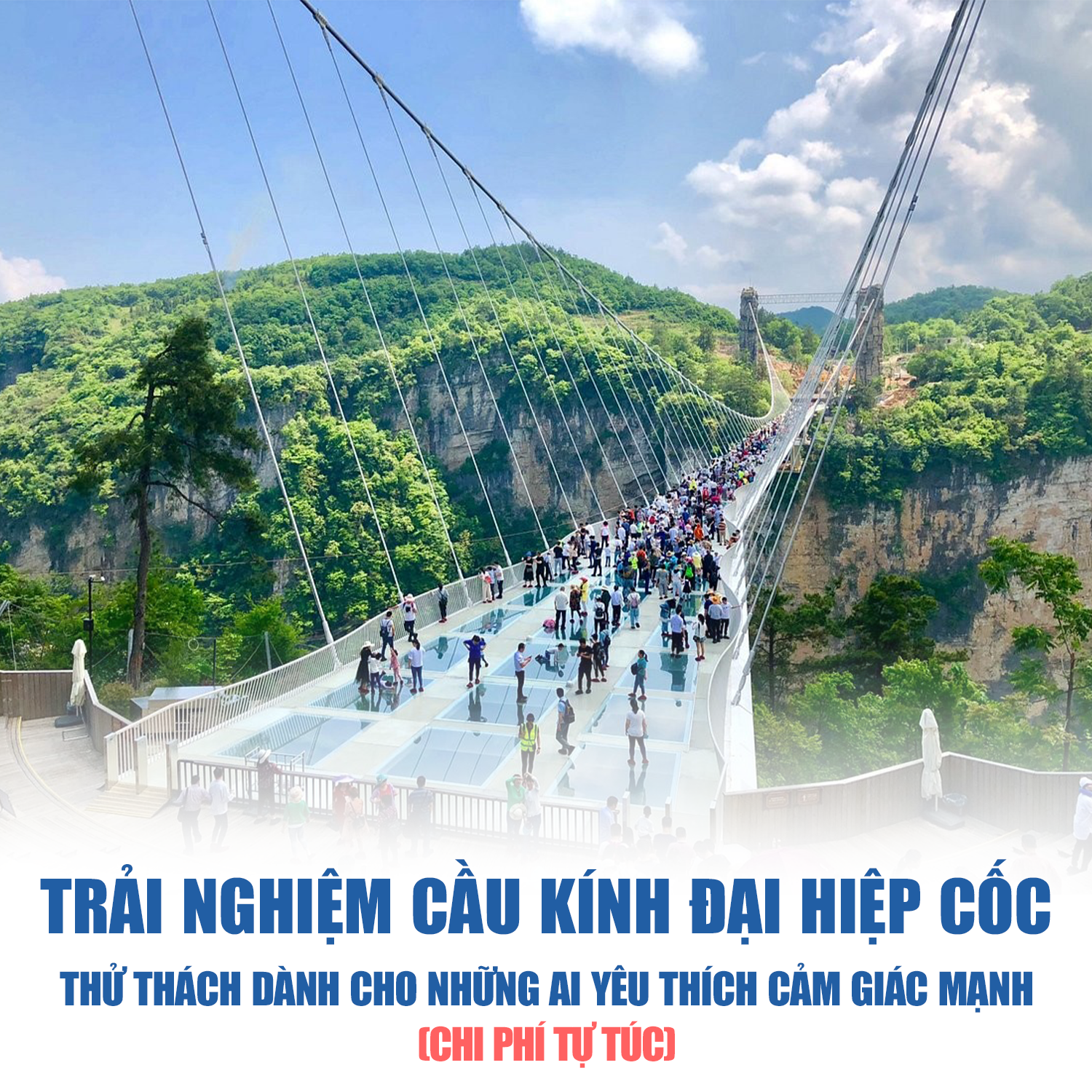Quý khách có thể chọn đi tham quan Cầu Kính Đại Hiệp Cốc Giá 420RMB/khách (chi phí tự túc). Đây là cây cầu kính cao và dài nhất thế giới, đứng trên cầu có thể ngắm nhìn toàn cảnh đáy thung lũng sâu 400 m; cây cầu siêu dài với cáp chống gió cho phép bạn tận hưởng trọn vẹn cảm giác kích thích đầy thú vị. Khách sẽ được sử dụng lối đi ưu tiên VIP, kèm theo gói quà tặng “Công nghệ thực tế ảo VR” trải nghiệm cảm giác ngồi trên khinh khí cầu du ngoạn thưởng thức cảnh sắc Đại Hiệp Cốc và Cầu Kính Trương Gia Giới