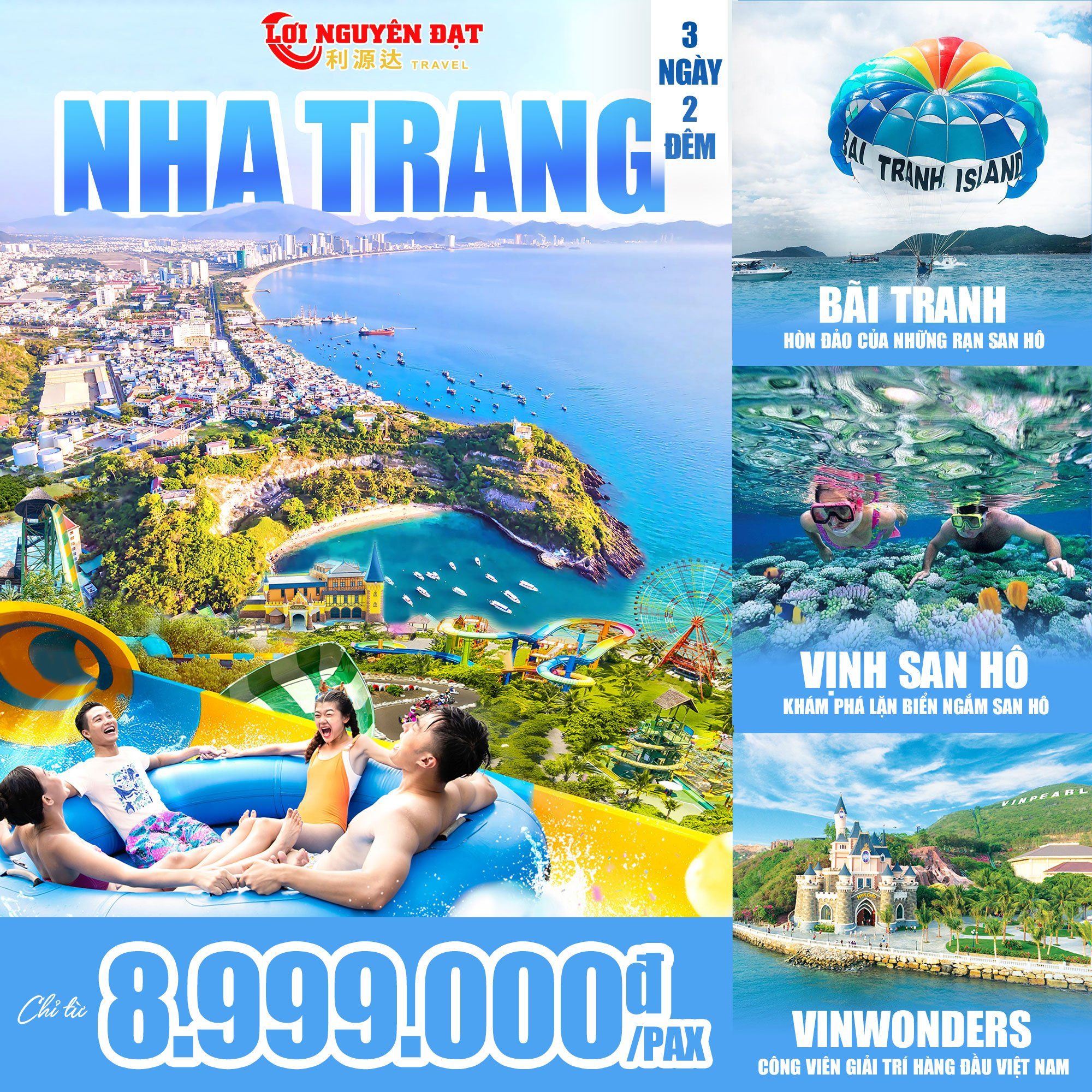 | NGÀY 2 | Xe 35C | - 6H30 dùng bữa sáng bún cá Cô Ba (105 Hoàng Hoa Thám, Nha Trang) - 7h30 di chuyển đi tour 3 đảo - 16h00 về lại khách sạn - 18H00 Ăn tối tại nhà hàng Yến Sào Khánh Hòa ( 22 Phạm Văn Đồng) | Trưa /Tối | GRAND TOURane |
